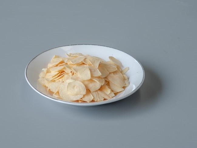 加工过程:大蒜→人工切底→分瓣→扒皮→分拣→清洗→切片→漂洗→甩水→烘干→筛选→风选→去石→色选→人工分拣→包装。